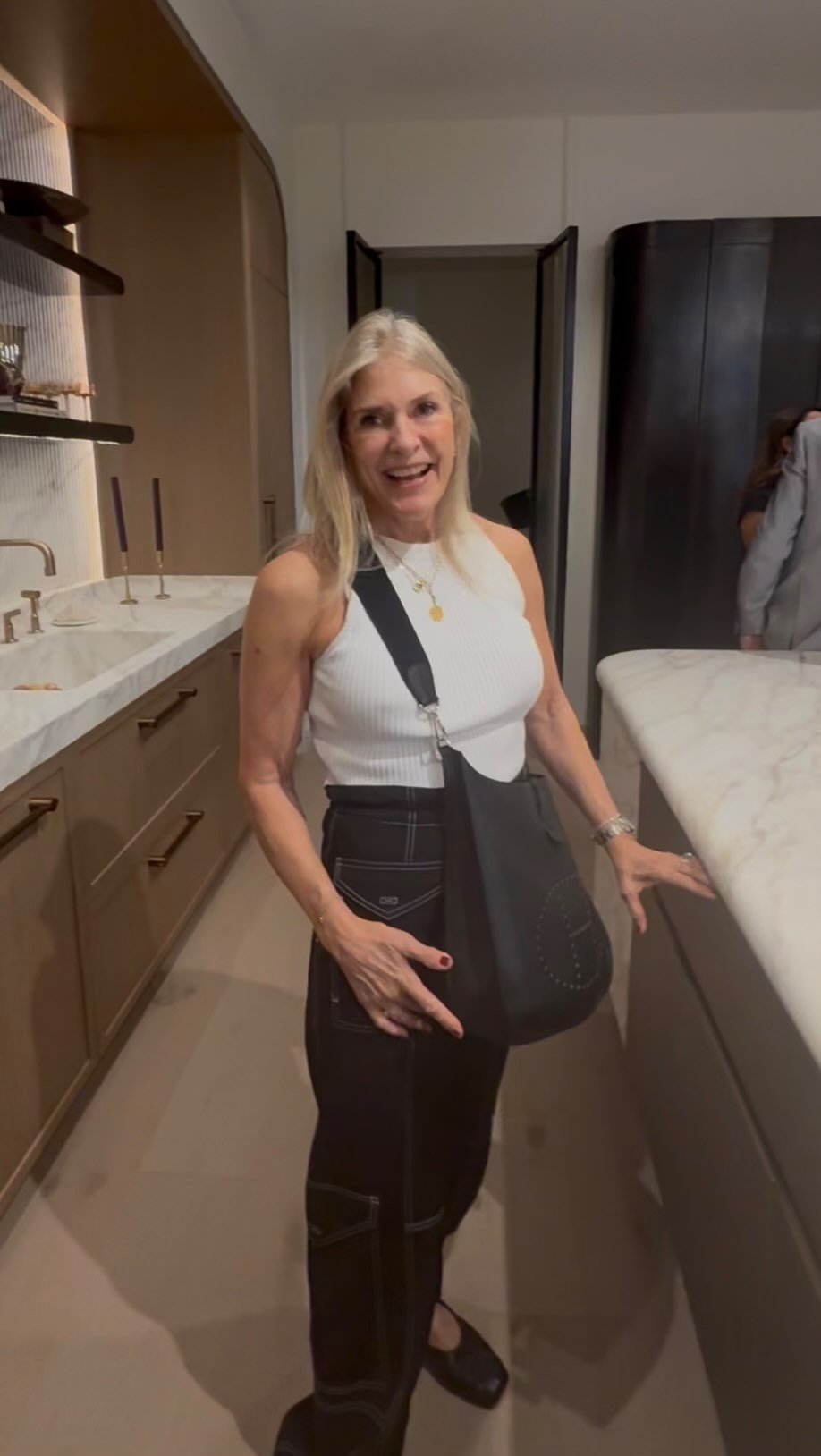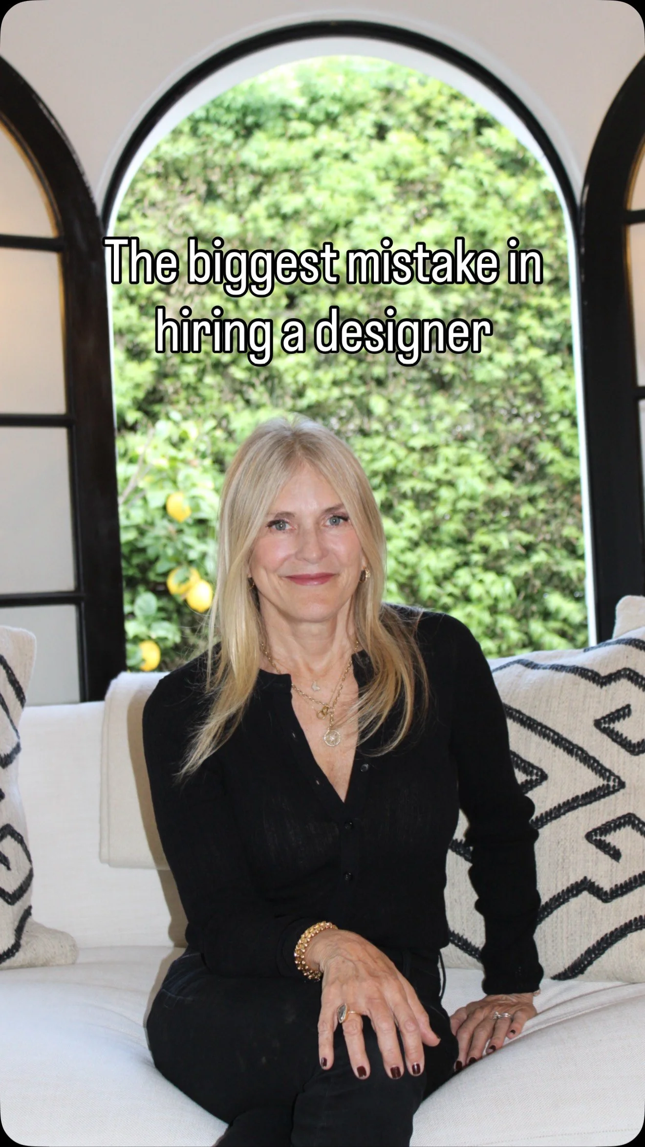 Modern kitchen with beige cabinetry, black hardware, stainless steel double oven, built-in microwave, black farmhouse sink, wooden countertop, hanging pendant light, plants near window